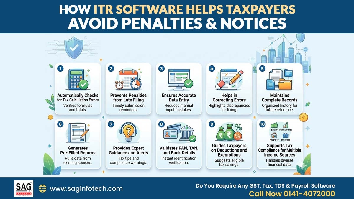 By accurately calculating figures and ensuring all valid deductions are taken into account, the software helps to prevent both underpayment and overpayment of taxes, which are frequent causes of penalties and notices from tax agencies.